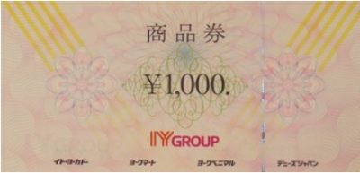 正式名称:IYグループ商品券 使用場所:イトーヨカドー・ヨークマート・デニーズ等 額 面:500円/1,000円 有効期限:ありません おつり:出ます