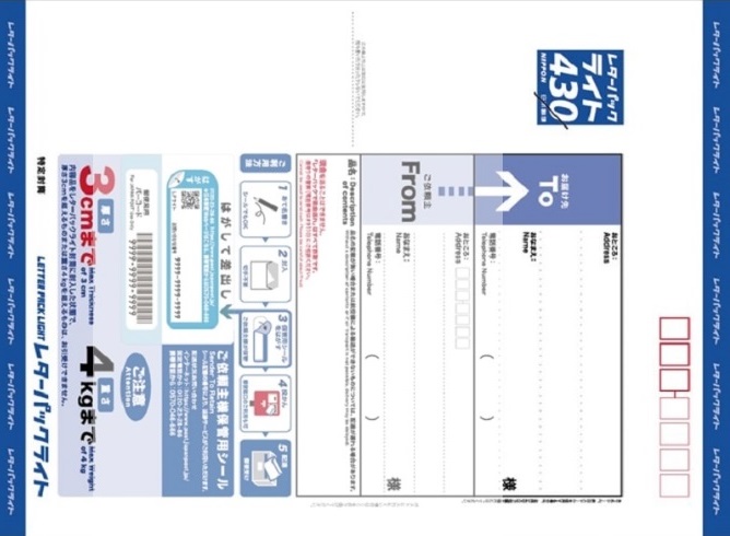 レターパックライトは、青い封筒で、封筒の大きさは縦340mm、横248mm。重量制限は4kg、厚さ制限は3cmとなり、受け取り側への配送方法がポスト投函となります。