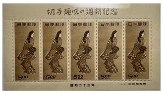 発行日:昭和23年11月29日(1948年) 発行枚数:150万枚 状態:未使用・シート 額面:5円×5枚(1シート) 図柄:見返り美人(菱川師宣)